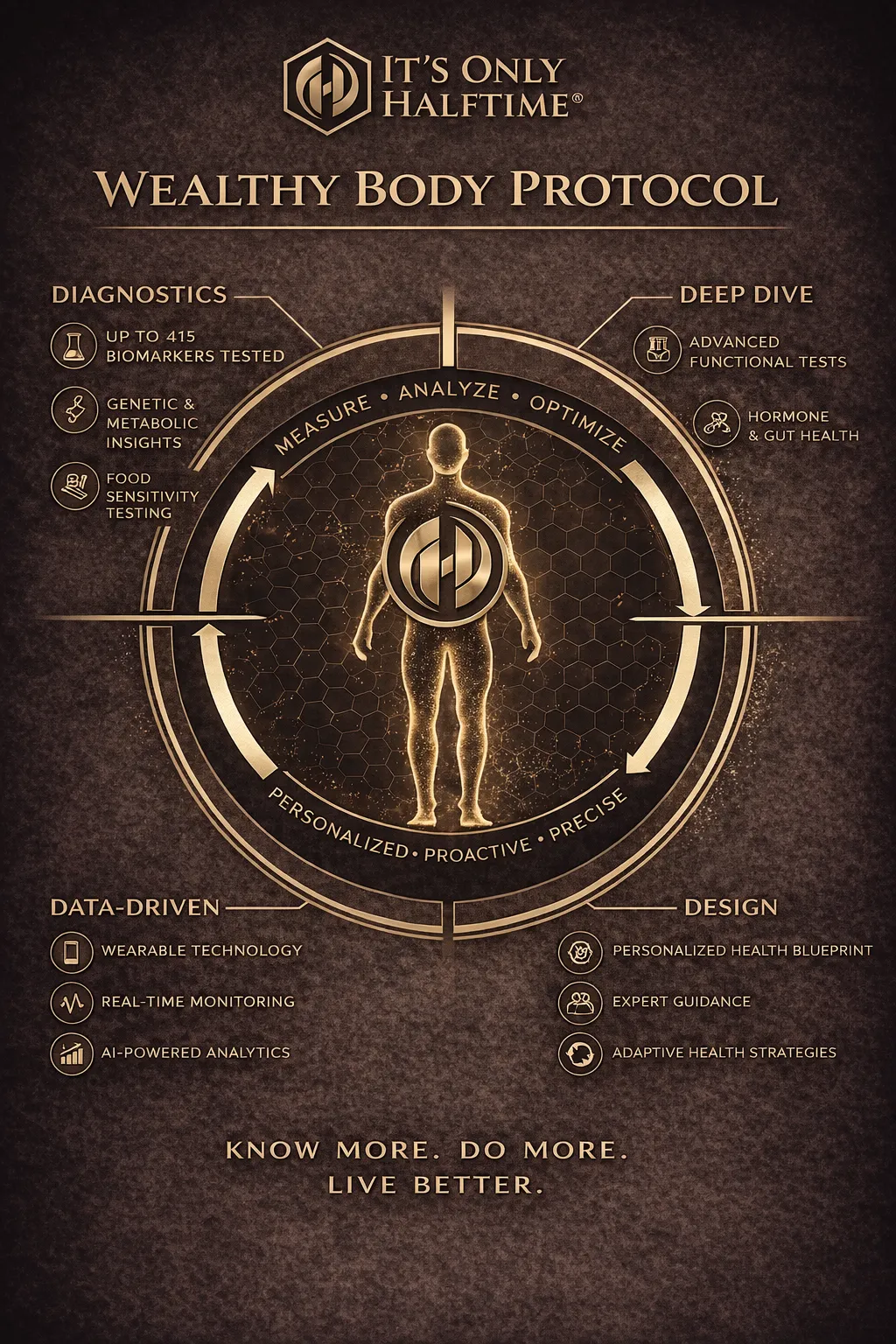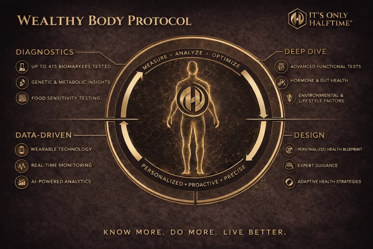 The Wealthy Body Protocol is a physician-led, three-phase system that goes beyond anything traditional medicine offers — evaluating up to 415 biomarkers to build a precision protocol built entirely around your biology.