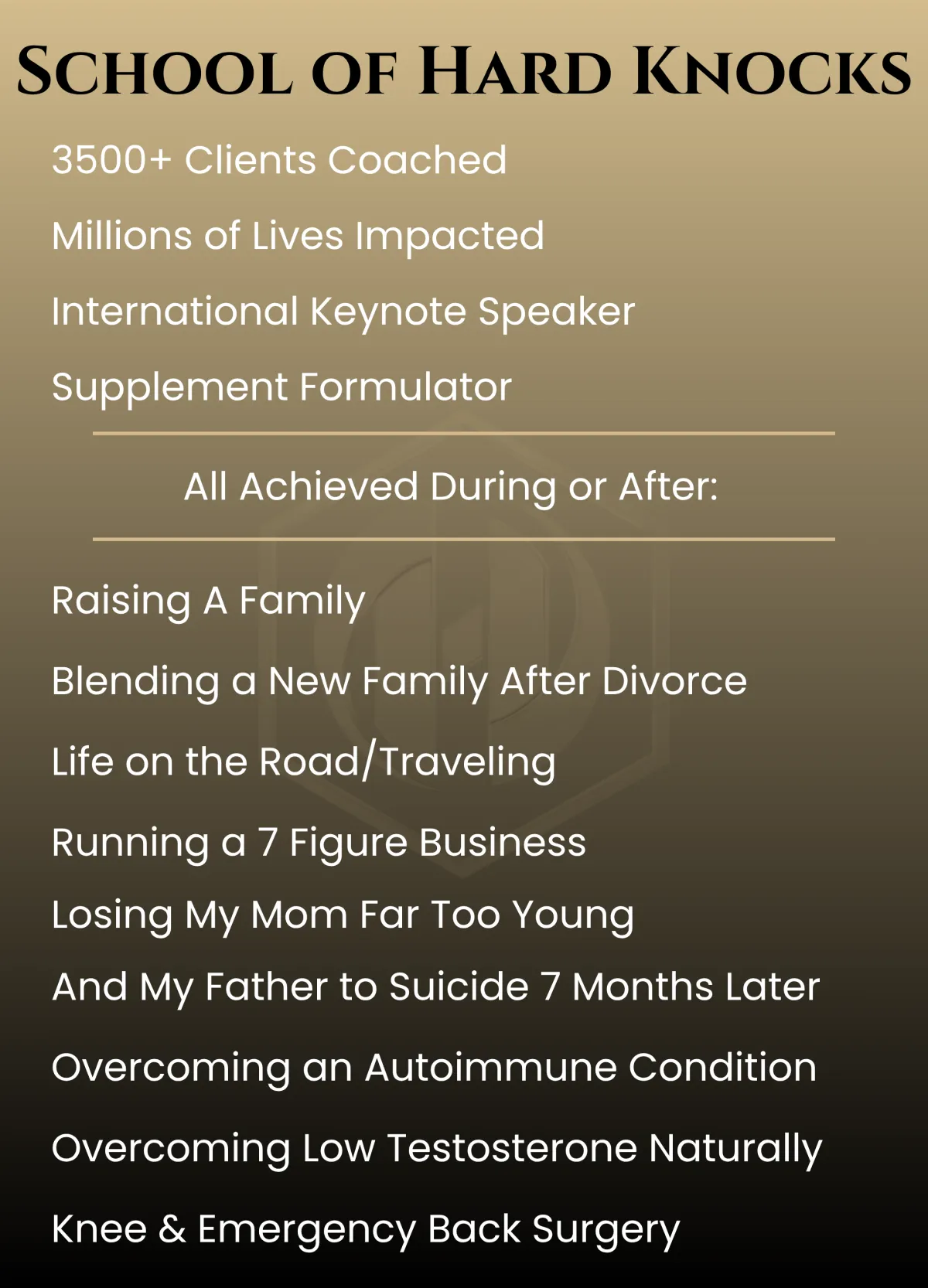 The autoimmune diagnosis. The crashed testosterone. The emergency back surgery. The divorce. The road. The loss of my mother — and my father to suicide seven months later.