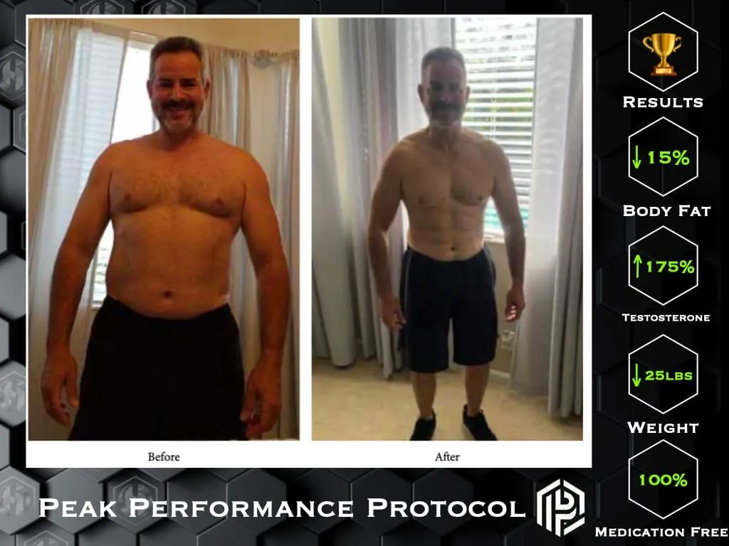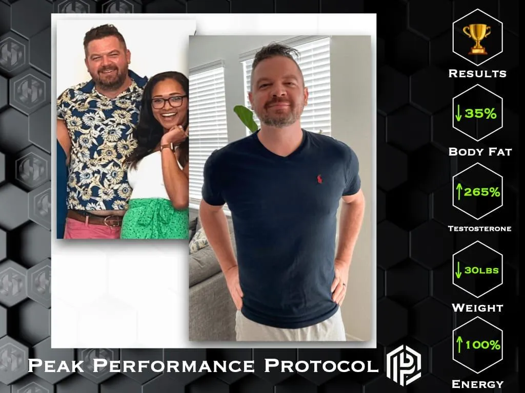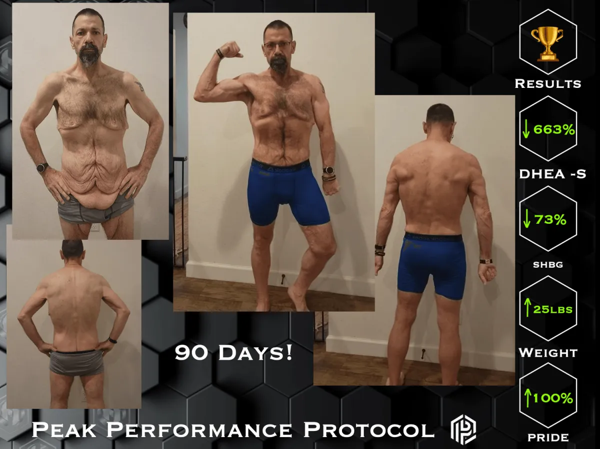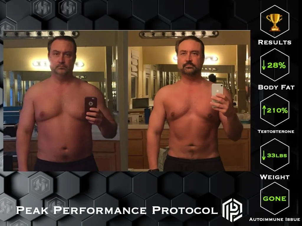 His approach was born out of personal experience. When faced with an autoimmune condition and low testosterone, he chose not to rely on medications. Instead, he applied the same principles now at the core of the Peak Performance Protocol — lifestyle, nutrition, and mindset — while asking his physician to monitor his progress.