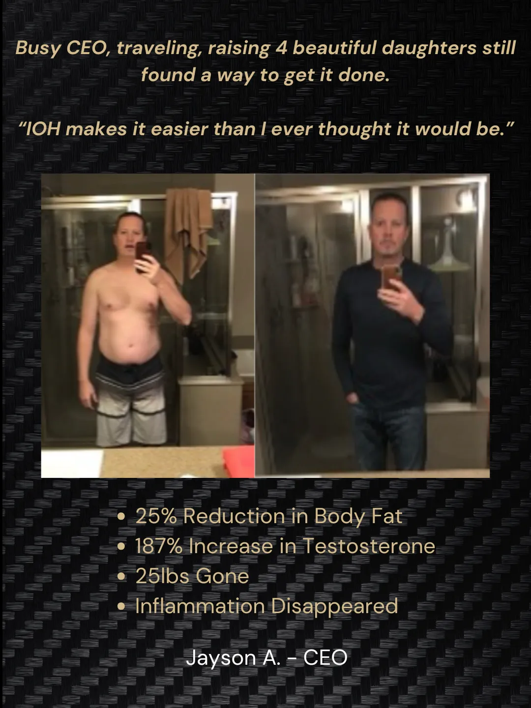 I shed nearly 25lbs, and even my lab results, including my Testosterone levels, are now in the healthy range. I feel fantastic, and I owe it all to the inspiration, tools, and unwavering support of the IOH family. I couldn't be happier with my newfound lease on life, and I'm incredibly proud and grateful for the transformation.”