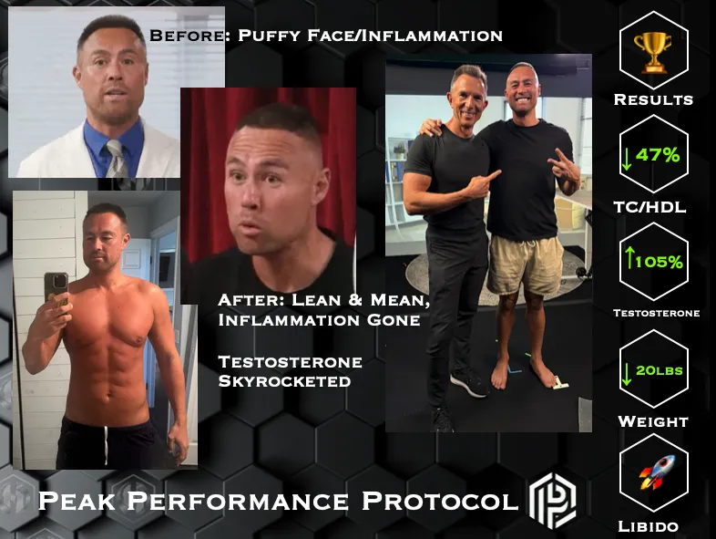 His approach was born out of personal experience. When faced with an autoimmune condition and low testosterone, he chose not to rely on medications. Instead, he applied the same principles now at the core of the Peak Performance Protocol — lifestyle, nutrition, and mindset — while asking his physician to monitor his progress.